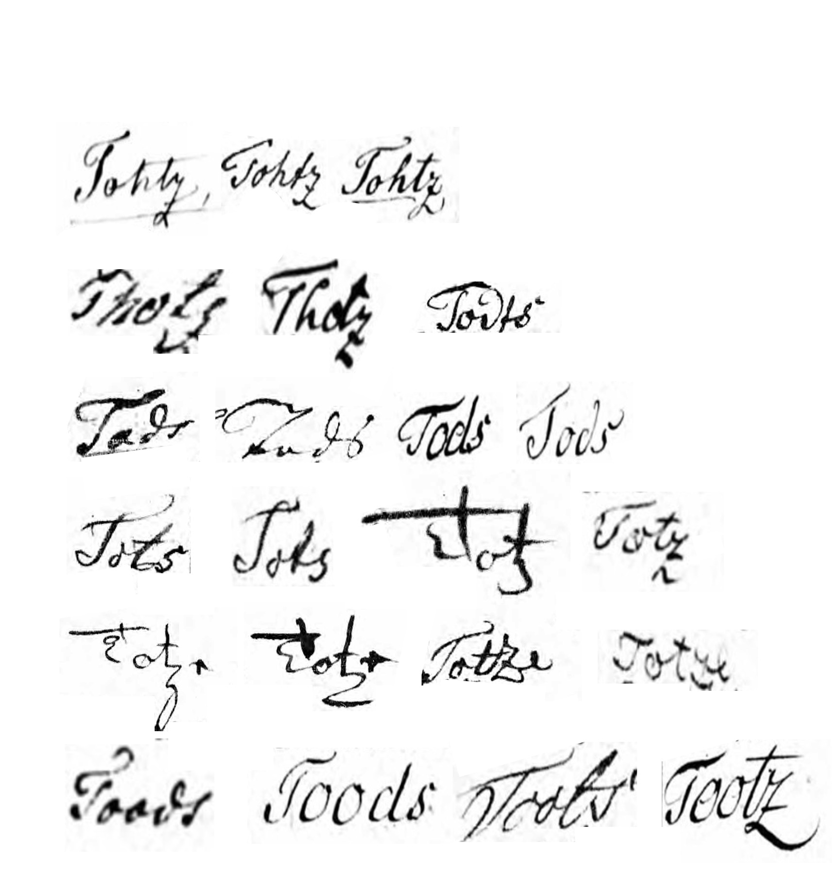 Die heutige Schreibweise des Familiennamens TOHTZ war in der Vergangenheit sehr variabel. Niedergeschrieben wurde der Name so, wie er verstanden wurde. So existieren für ein und dieselbe Person in den Kirchenbüchern durchaus differierende Namenseinträge.